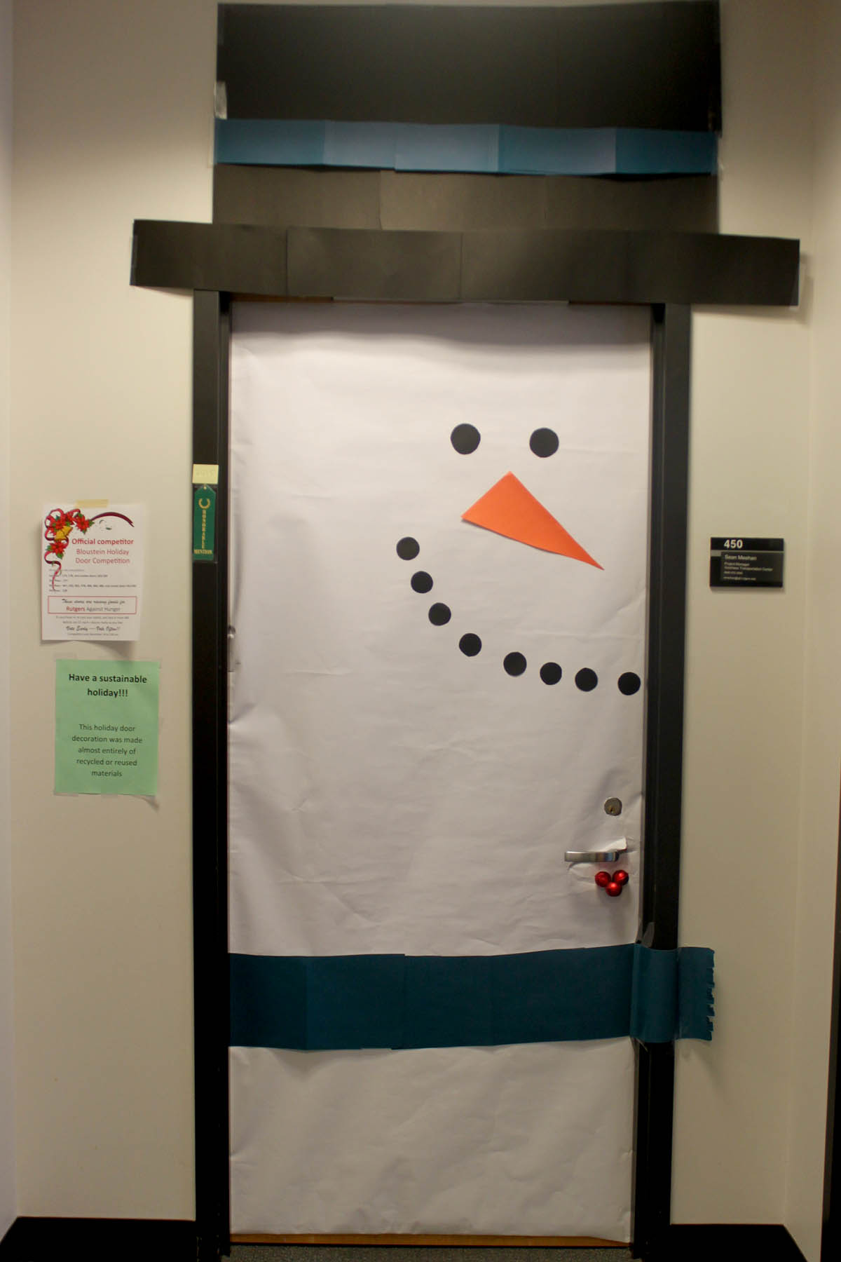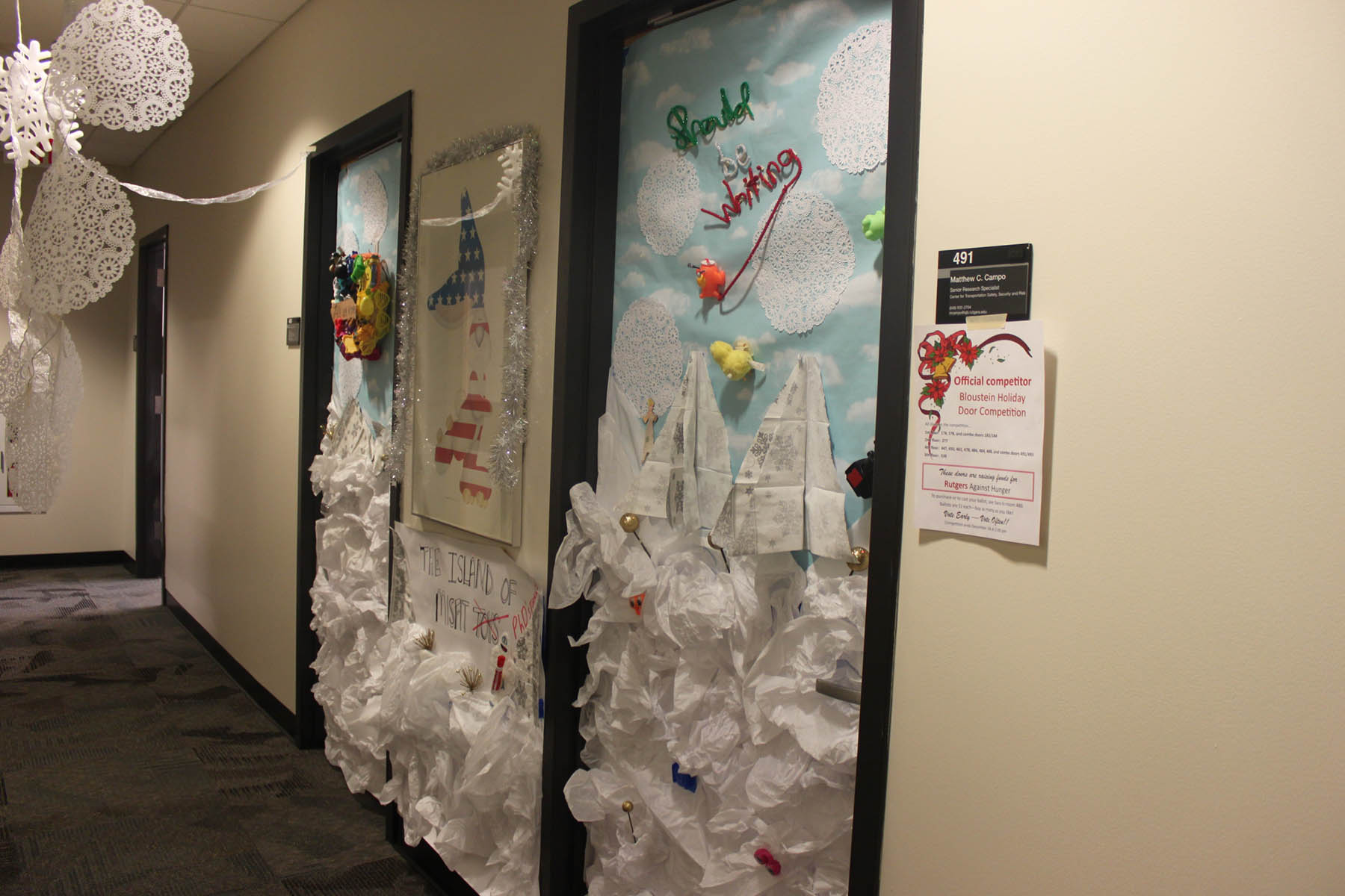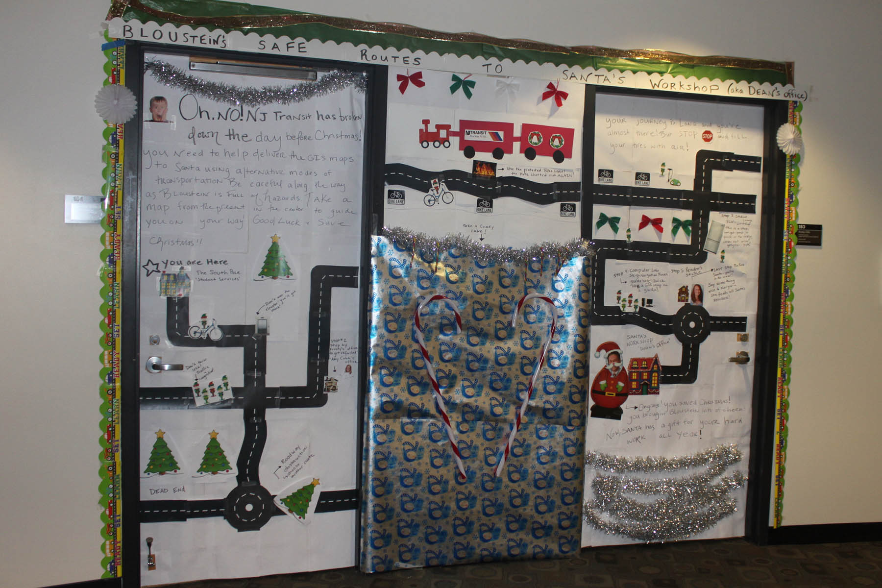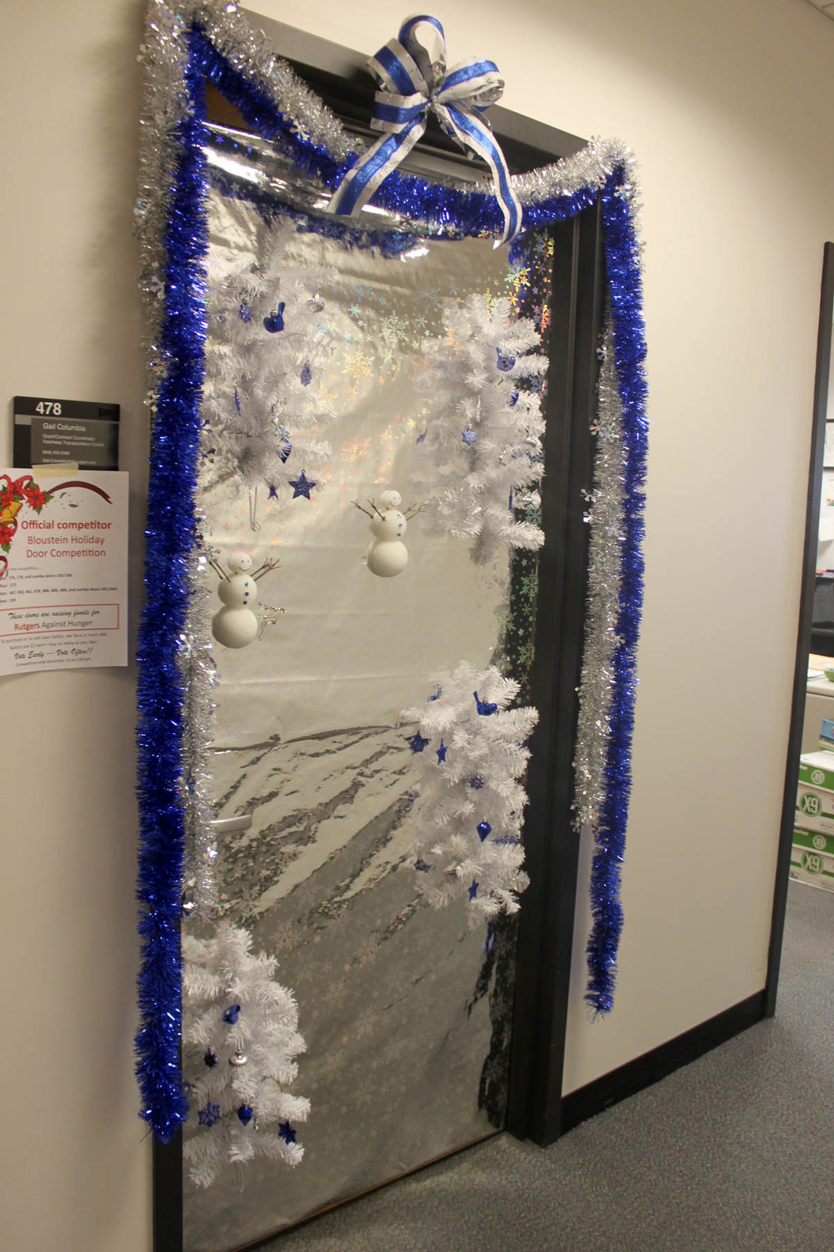 Bloustein School faculty and staff at the school participated in a Holiday Door Decorating Contest to raise funds for Rutgers Against Hunger. Congratulations to first place winners Krystyn Kmac Kitto and Courtney Culler on their “Safe Routes to the Dean’s Office” themed door! The Bloustein Center for Survey Research made a group effort for their door and placed second, and Voorhees Transportation Center staff member Gail Columbia took third. The school raised over $300 by having faculty and staff purchase ballots to pick the winner. Click on the photos to see all of the participants full size.
