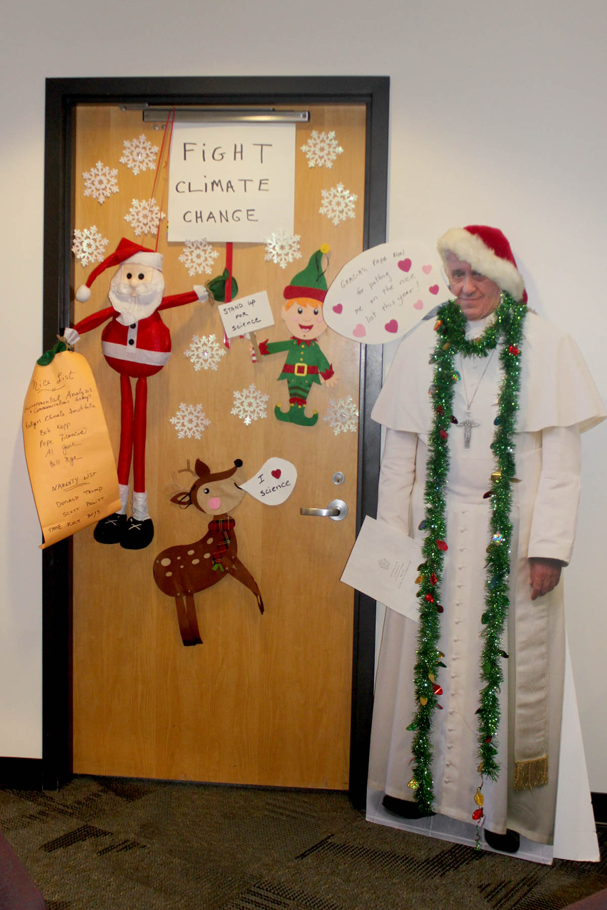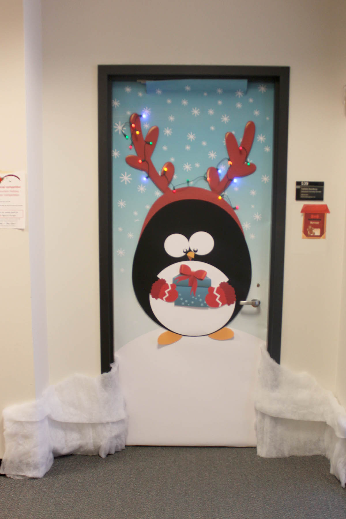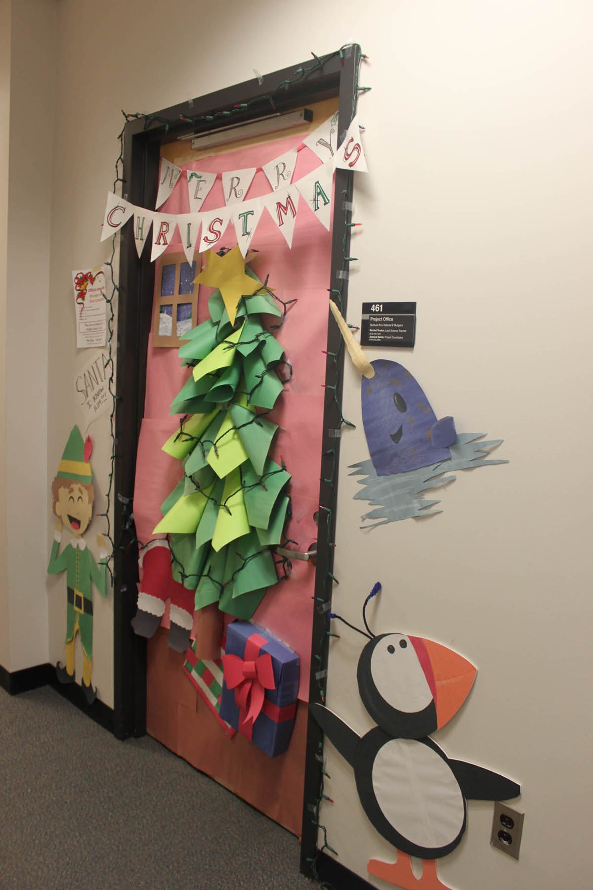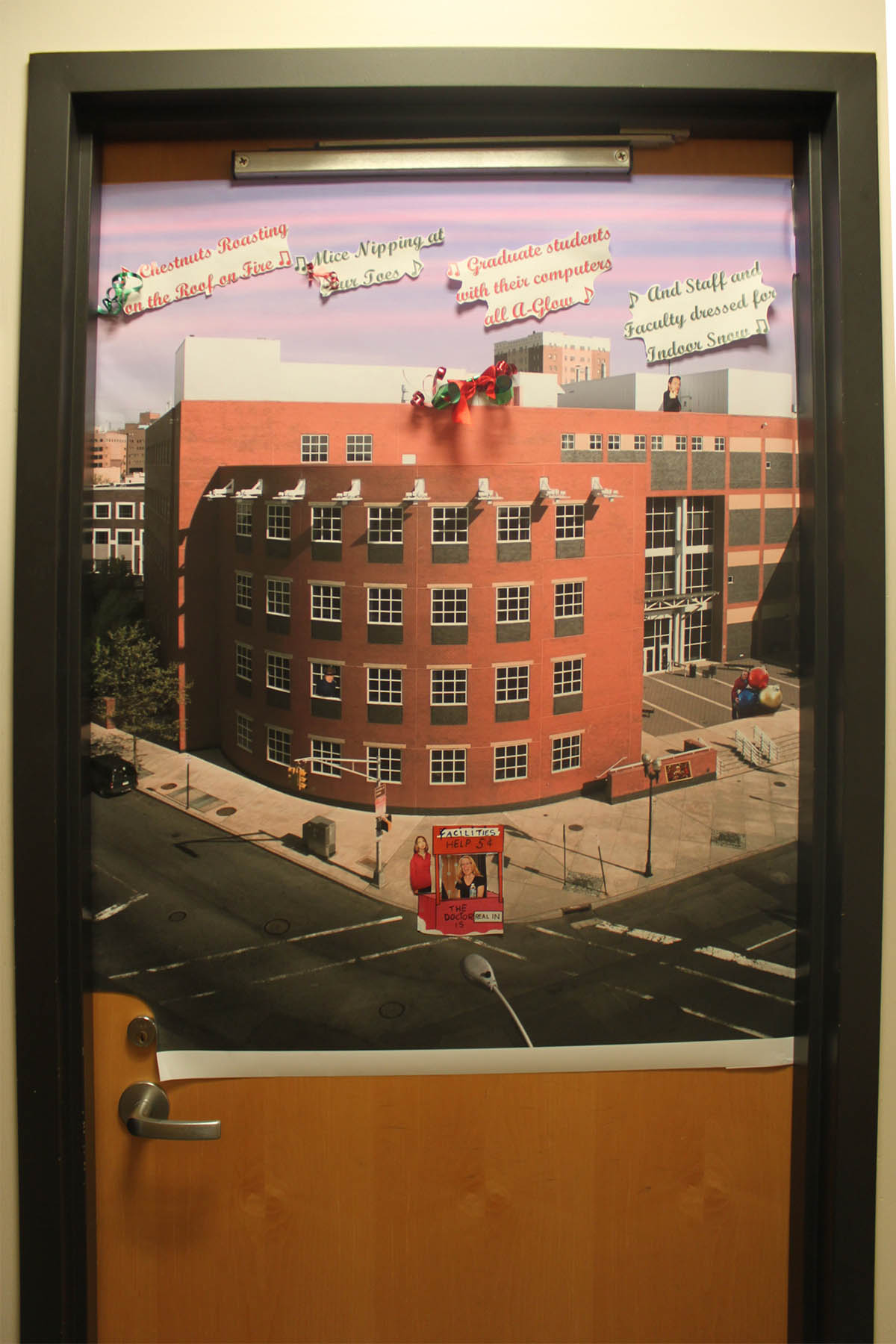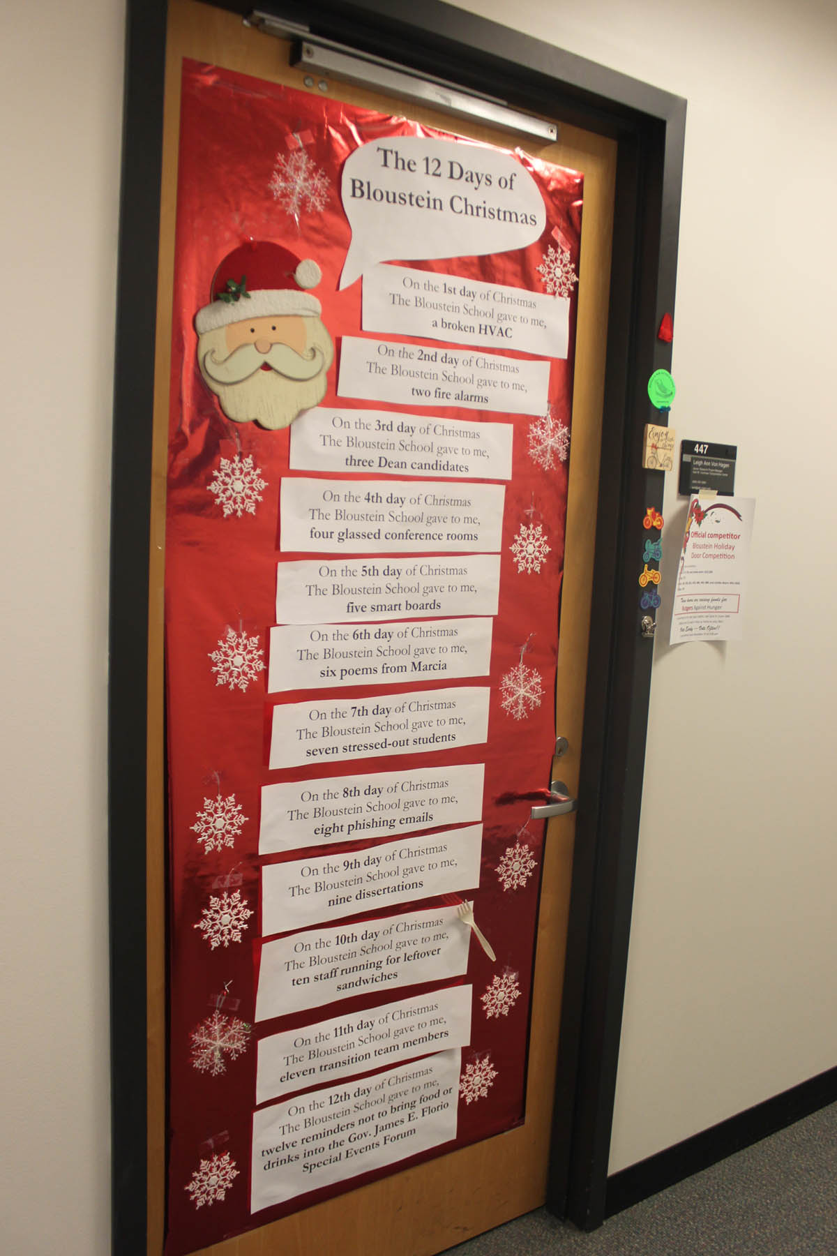 Bloustein School faculty and staff at the school participated in a Holiday Door Decorating Contest to raise funds for Rutgers Against Hunger. Congratulations to first place winners Krystyn Kmac Kitto and Courtney Culler on their “Safe Routes to the Dean’s Office” themed door! The Bloustein Center for Survey Research made a group effort for their door and placed second, and Voorhees Transportation Center staff member Gail Columbia took third. The school raised over $300 by having faculty and staff purchase ballots to pick the winner. Click on the photos to see all of the participants full size.