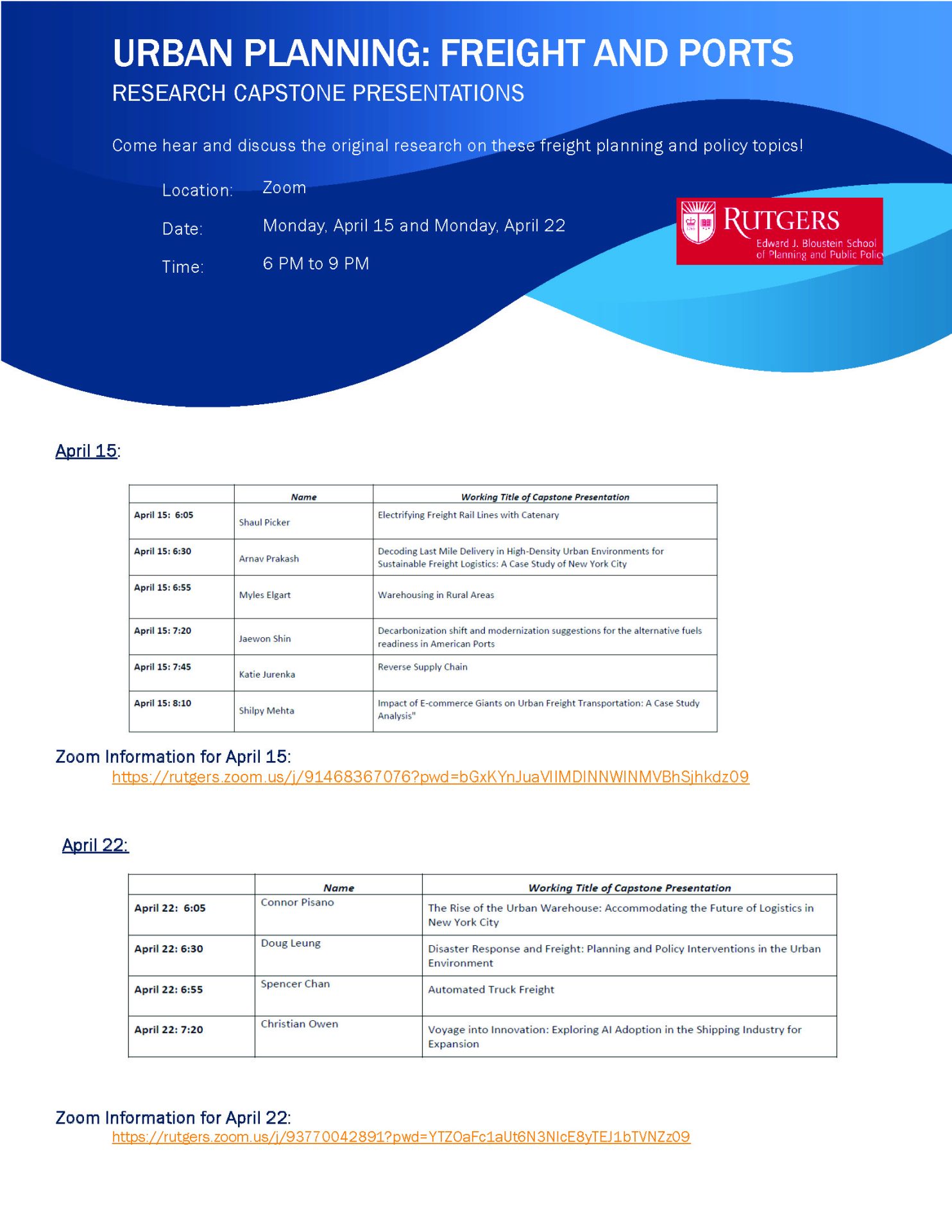 These events will be held on Zoom only; please check the Bloustein listserv for an email sent out with Meeting ID and passcode information.