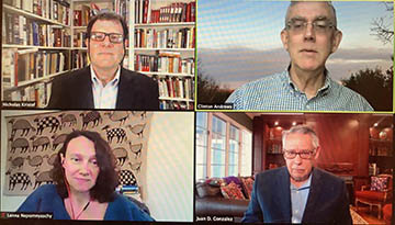 From top left, clockwise: Nicholas D. Kristof; Clinton Andrews, Professor and Associate Dean for Research, Bloustein School. Bloustein School; Juan D. Gonzalez, professor of professional practice, journalism and media studies, School of Communication and Information, Rutgers University; and Lenna Nepomnyaschy, associate professor, School of Social Work, Rutgers University.