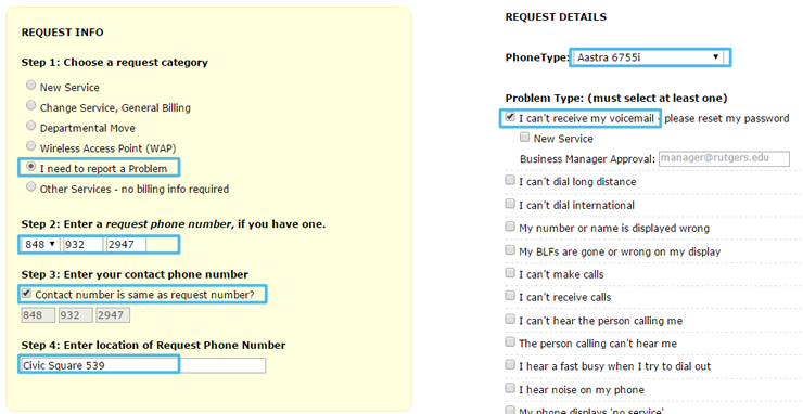 - In Problem type select the first checkbox: “I can’t receive my voicemail – please reset my password”