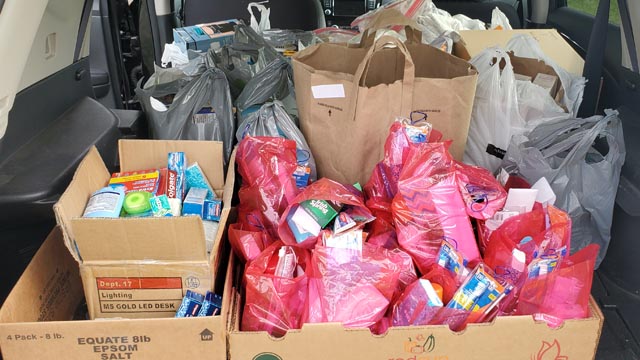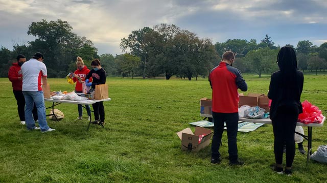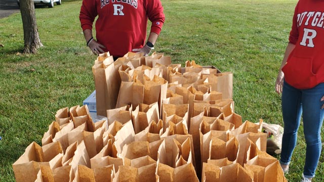 Graduate students gathered food supplies from the kitchen’s wishlist as well as necessary hygiene products and clothing items. In just one month, they were able to gather every single item from the list and more. Following both EP and Rutgers’ social distancing guidelines, the students met at a local park, donned masks and gloves, and packed more than 100 snack and hygiene bags, as well as the bulk items and donations including rice, pasta, oil, and clothing items. They packed three cars full of donations to make the trip over and deliver the items to Chef Curtis and his team at EP.