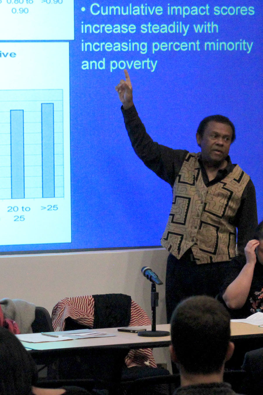 Dr. Nicky Sheats, Esq., Director of the Center for the Urban Environment at the John S. Watson Institute for Public Policy, Thomas Edison State University, opened the Catlin lecture with a discussion of the backdrop for the conditions that prompted development of the ordinance and the rationale among advocates and local officials for pursuing an approach focusing on land use. Some of the questions he focused on were, how do multiple pollutants interact with each other in an environment, and what social implications do they have? What do these pollutants mean for the community? And finally, while governments attempt to regulate pollutants in a way that does not breach individuals’ standards, how are those standards defined?