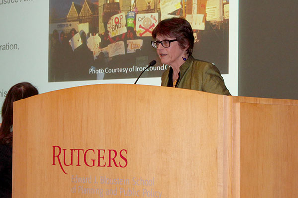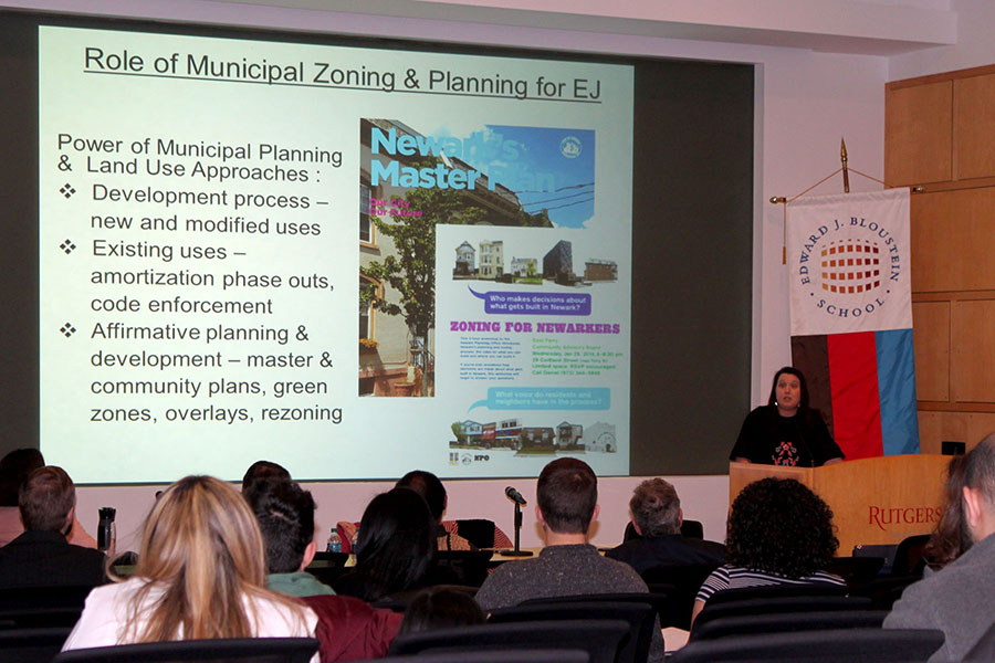 Cynthia Mellon, co-chair of the City of Newark Environmental Commission and Coordinator of the Newark Environmental Resource Inventory, concluded the lecture by discussing what it is like to get an ordinance implemented. She began by explaining that Newark’s environmental justice ordinance is a landmark policy, as it is the first of its kind in a major New Jersey city, and other cities and communities have thus expressed great interest in it. Newark’s policy was advanced through advocacy and community organization. Ms. Mellon provided a snapshot of Newark’s environmental checklist, and in particular the top five problems Newark faces: truck trips giving off diesel emissions, particulate from other sources (for example, grain storage), emissions from vehicle idling, low tree cover, and impervious surfaces. Her lecture concluded with a listing of some very valuable resources for aspiring environmental justice activists.